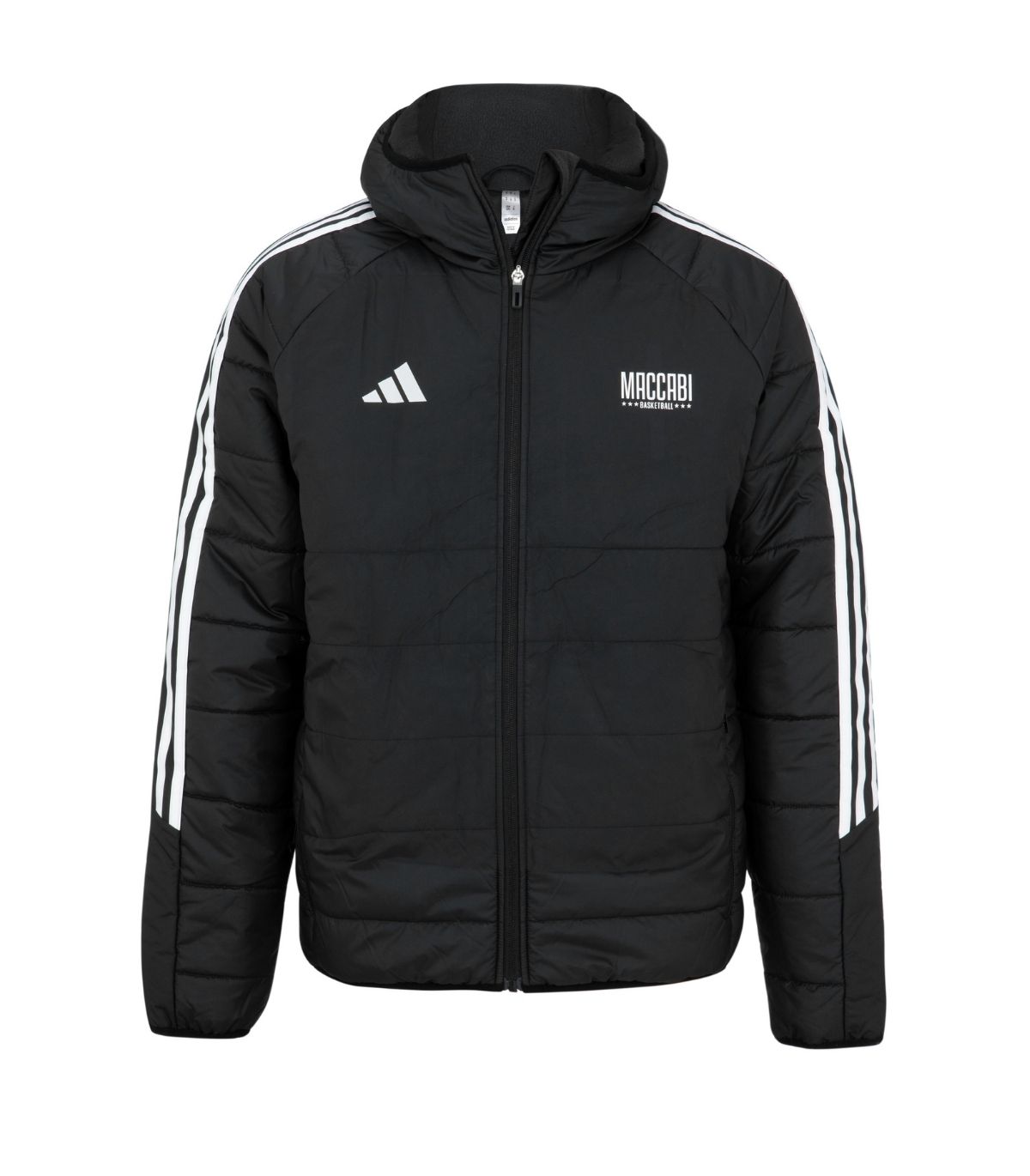 מעיל נסיעות ADIDAS של מכבי תל אביב כדורסל בצבע שחור לבוגרים עם הכיתוב 'MACCABI BASKETBALL'