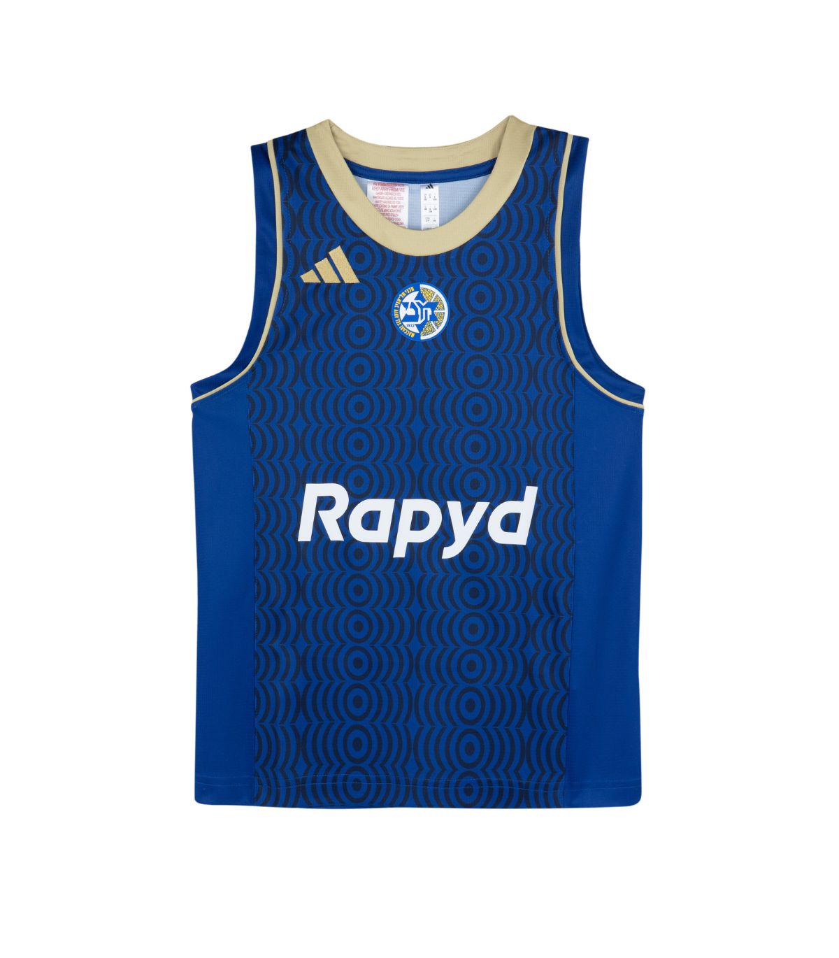 גופיית משחק חוץ רשמית מבד רפליקה ADIDAS כחולה לילדים של מועדון הכדורסל מכבי תל אביב לעונת 2025-26