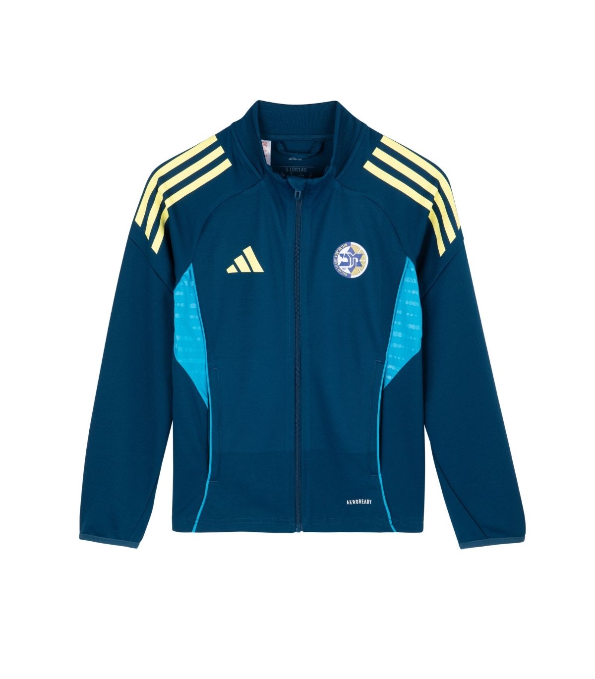 ג'קט ייצוג שחקנים ADIDAS של מכבי תל אביב כדורסל בצבעים צהוב כחול לילדים.