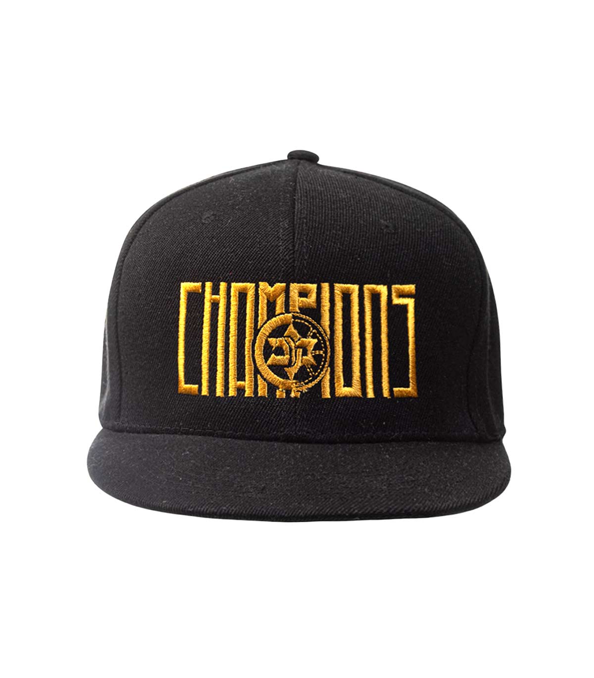 כובע מצחיה ישרה (Snapback) בצבע שחור עם רקמה מובלטת בצבע זהב עם הכיתוב CHAMPIONS בשילוב לוגו המועדון