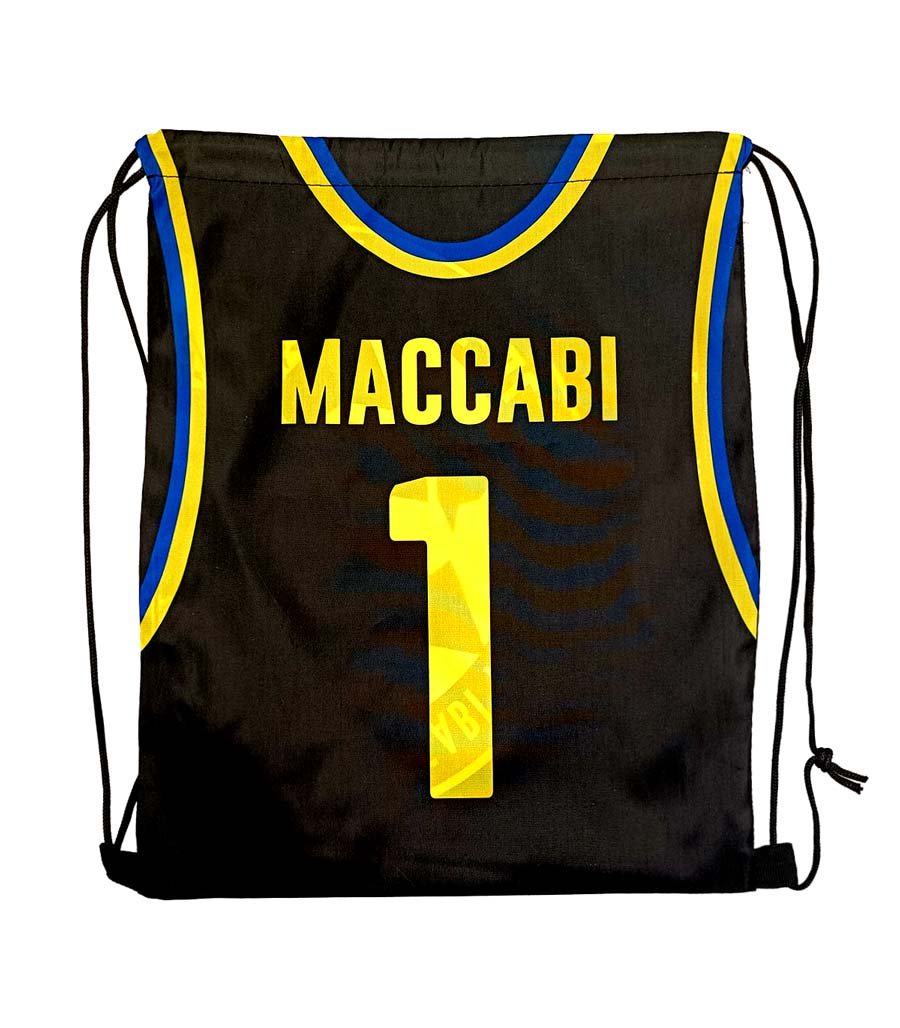 תיק שרוך שחור דו צדדי של מועדון הכדורסל מכבי תל אביב, עם הדפס צבעוני ומדליק